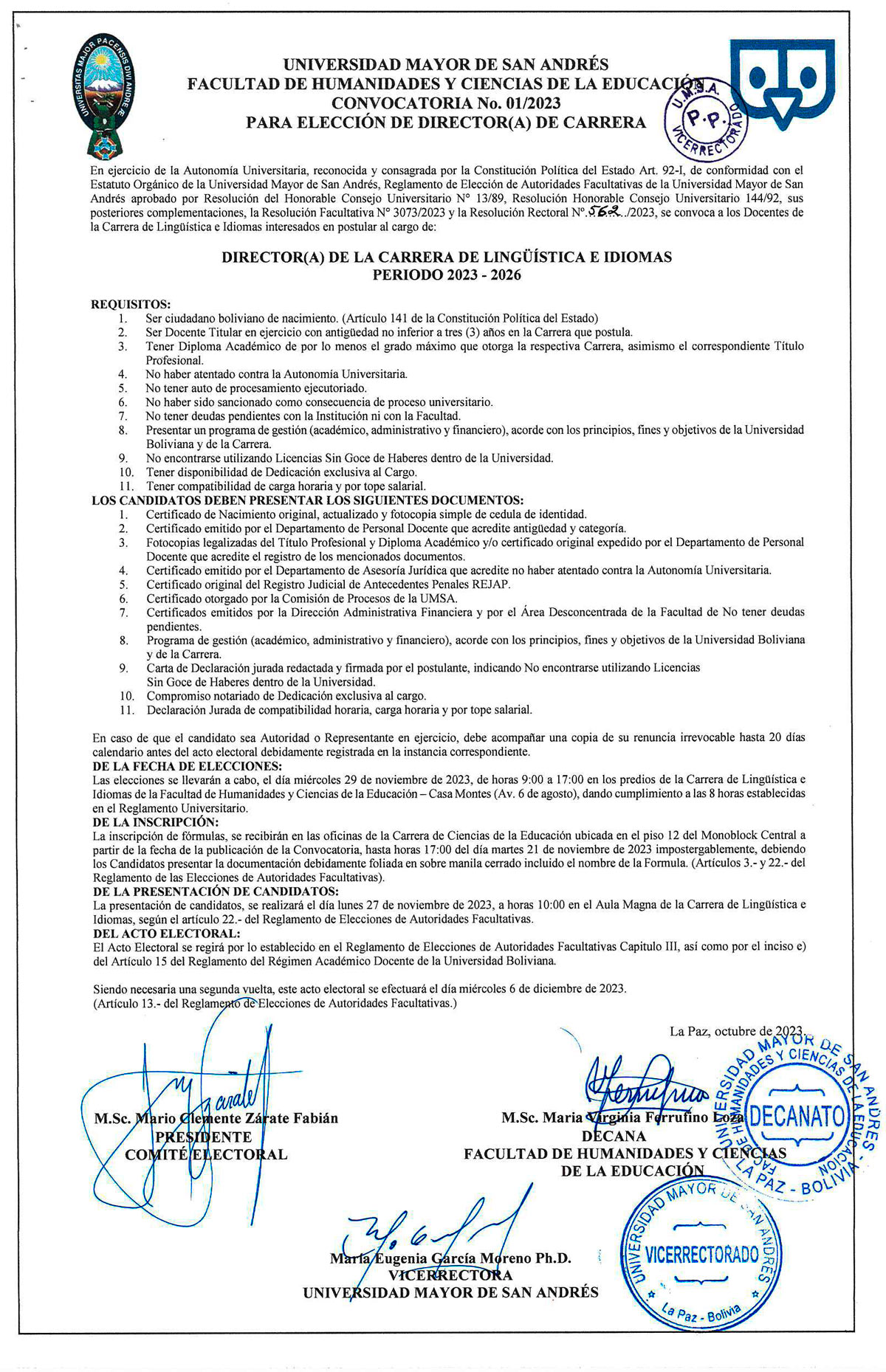 ELECCIÓN RECTOR(A) Y VICERRECTOR GESTIÓN 2024-2027 UNIVERSIDAD MAYOR DE SAN ANDRÉS