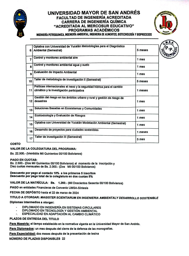 MAESTRÍA EN INGENIERIA AMBIENTAL Y DESARROLLO SOTENIBLE PRIMERA VERSIÓN - MODALIDAD SEMIPRESENCIAL GESTIÓN ACADÉMICA 2024
