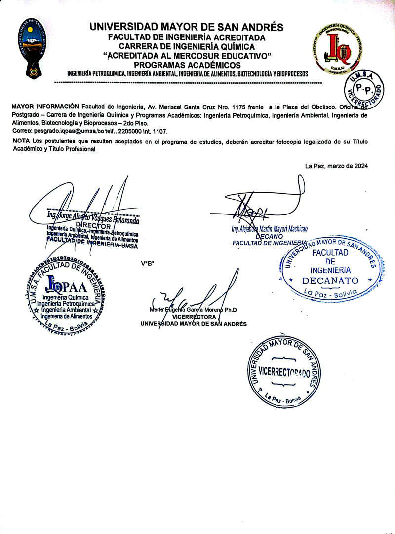➡ CONVOCATORIA: La Unidad de Posgrado de la Carrera de Ingeniería Química y sus programas académicos Ingeniería Petroquímica, Ingeniería Ambiental, Ingeniería de Alimentos, Biotecnología y Bioprocesos de la Facultad de Ingeniería de la #UMSA invita a profesionales a cursar la Maestría en: