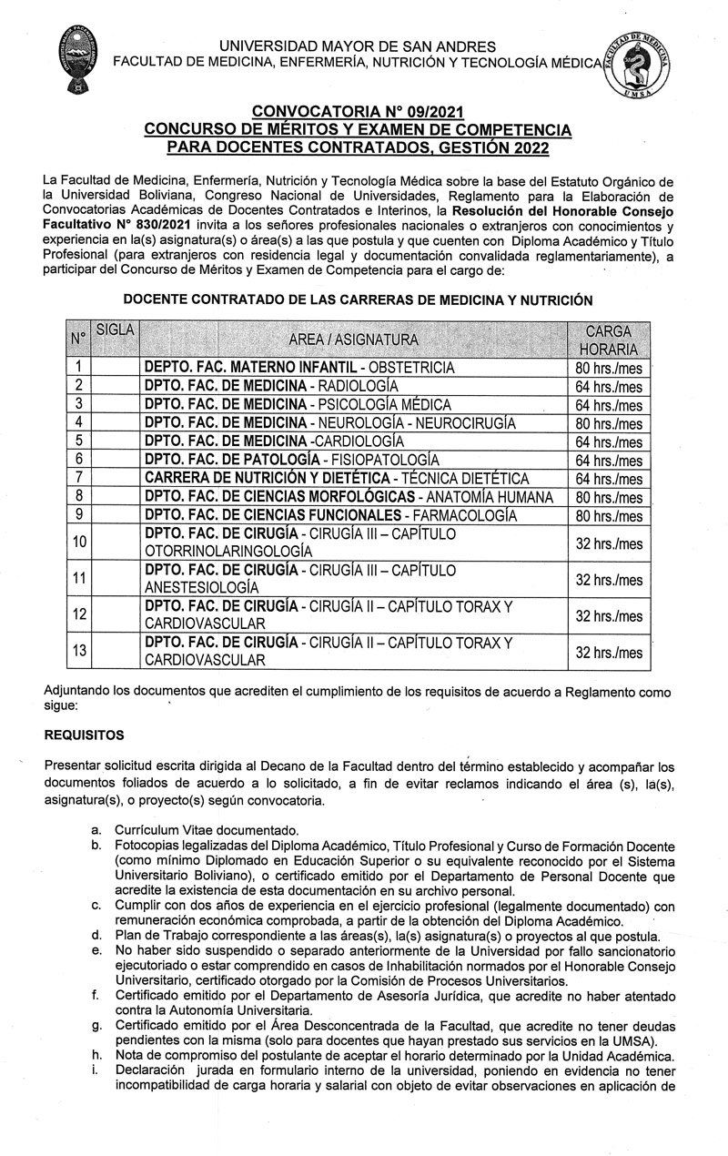 La Facultad de Medicina, Enfermería, Nutrición y Tecnología Médica sobre la base del Estatuto Orgánico de la Universidad Boliviana, Congreso Nacional de Universidades, Reglamento para la Elaboración de Convocatorias Académicas de Docentes Contratados e Interinos, la Resolución del Honorable Consejo Facultativo N° 830/2021 invita a los señores profesionales nacionales o extranjeros con conocimientos y experiencia en la(s) asignatura(s) o área(s) a las que postula y que cuenten con Diploma Académico y Título Profesional (para extranjeros con residencia legal y documentación convalidada reglamentariamente), a participar del Concurso de Méritos y Examen de Competencia.