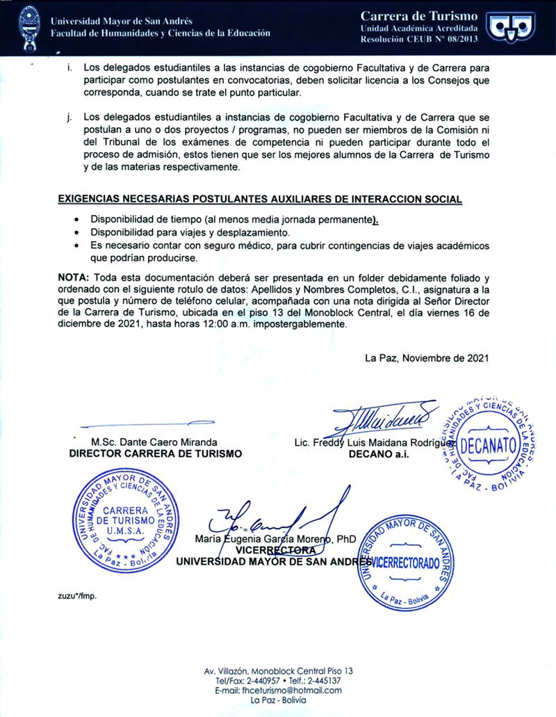 La Carrera de Turismo sobre la base del Estatuto Orgánico da la Universidad Boliviana, el Reglamento General de Auxiliares Academ0os de la UMSA aprobado con Resolución H.C.U. No. 251/2021; Complementado y Enmendado mediante Resoluciones HOU. N° 437 y 623/2021 y la Resolución Rectoral N° 897/2021. Invita a los señores estudiantes de la Carrera de Turismo, a participar del Concurso de Mitos y Examen de Competencia para el cargo de "Auxiliar. de Interacción Social, para proyectos/programas o convenio.