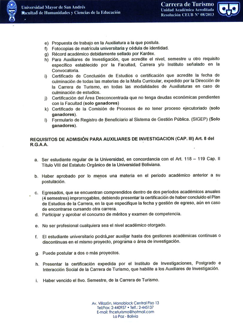 La Carrera de Turismo sobre la base del Estatuto Orgánico de la Universidad Boliviana, el Reglamento General de Auxiliares Académicos de la UMSA aprobado con Resolución H.C.U. No. 251/2021; Complementado y Enmendado mediante Resoluciones H.C.U. N° 437 y 623/2021 y la Resolución Rectoral N° 898/2021, invita a los señores estudiantes de la Carrera de Turismo, a participar del Concurso de Méritos y Examen de Competencia para el cargo de "Auxiliares de Investigación".
