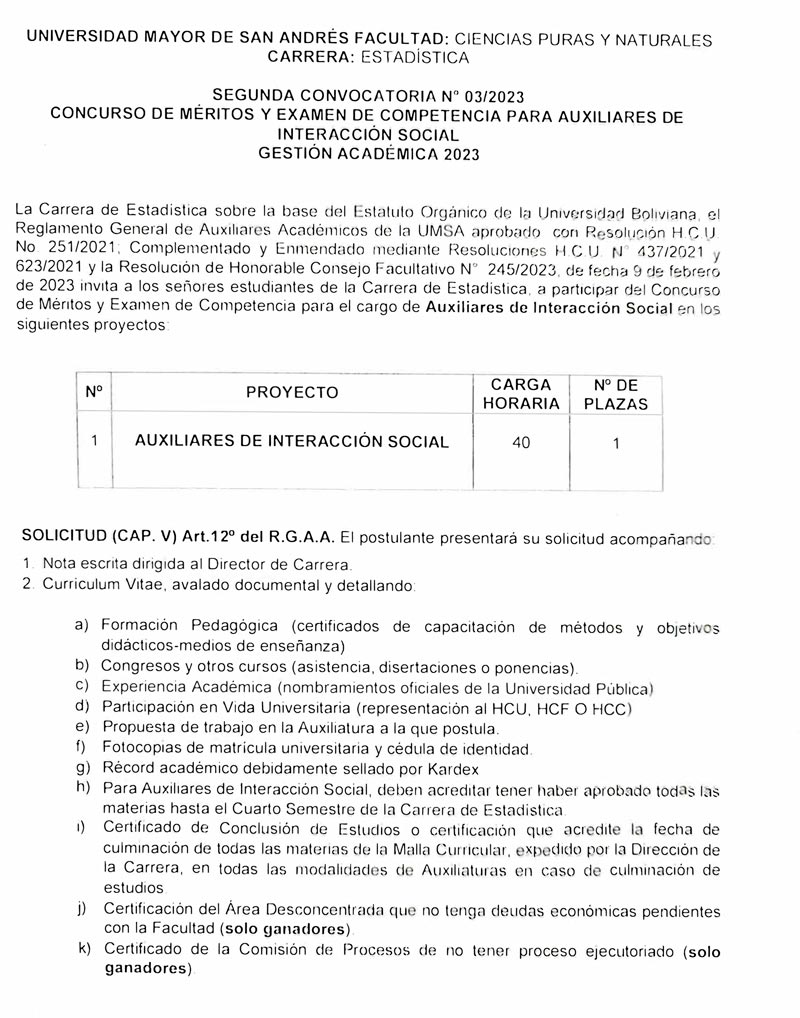 CONVOCATORIA PARA AUXILIARES CARRERA DE ESTADÍSTICA (SEGUNDA CONVOCATORIA – GESTIÓN ACADÉMICA 2023)