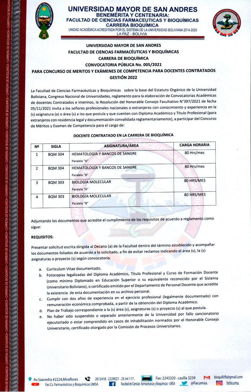 La Facultad de Ciencias Farmacéuticas y Bioquímicas sobre la base del Estatuto Orgánico de la Universidad Boliviana, Congreso Nacional de Universidades, Reglamento para la Elaboración de Convocatorias Académicas de docentes Contratados e Interinos, la Resolución del Honorable Consejo Facultativo N°398/2021 de fecha 05/11/2021 invita a los señores profesionales nacionales o extranjeros con conocimiento y experiencia en la asignatura (s) o área (s) a las que postula y que cuenten con Diploma Académico y Título Profesional (para extranjeros con residencia legal y documentación convalidada reglamentariamente), a participar del Concurso de Méritos.