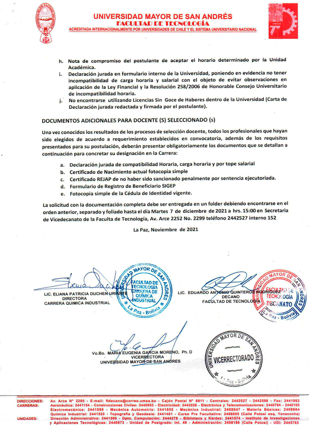 La Facultad de Tecnología sobre la base del Estatuto Orgánico de la Universidad Boliviana, Congreso Nacional de Universidades, Reglamento para la Elaboración de Convocatorias Académicas de Docentes Contratados e Interinos, la Resolución de Honorable Consejo Facultativo HCF N° 1347/2021 invita a los señores profesionales nacionales o extranjeros con conocimiento y experiencia en la (s) asignatura (s) o áreas (s) a las que postula y que cuenten con Diploma Académico y Título Profesional (para extranjeros con residencia legal y documentación convalidada reglamentariamente), a participar del Concurso de Méritos.