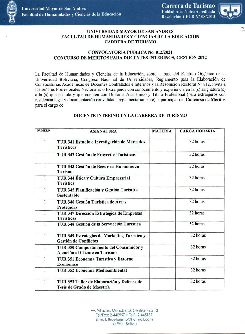 CONVOCATORIA PÚBLICA No. 012/2021 CONCURSO DE MÉRITOS PARA DOCENTES INTERINOS GESTIÓN 2022 - CARRERA DE TURISMO